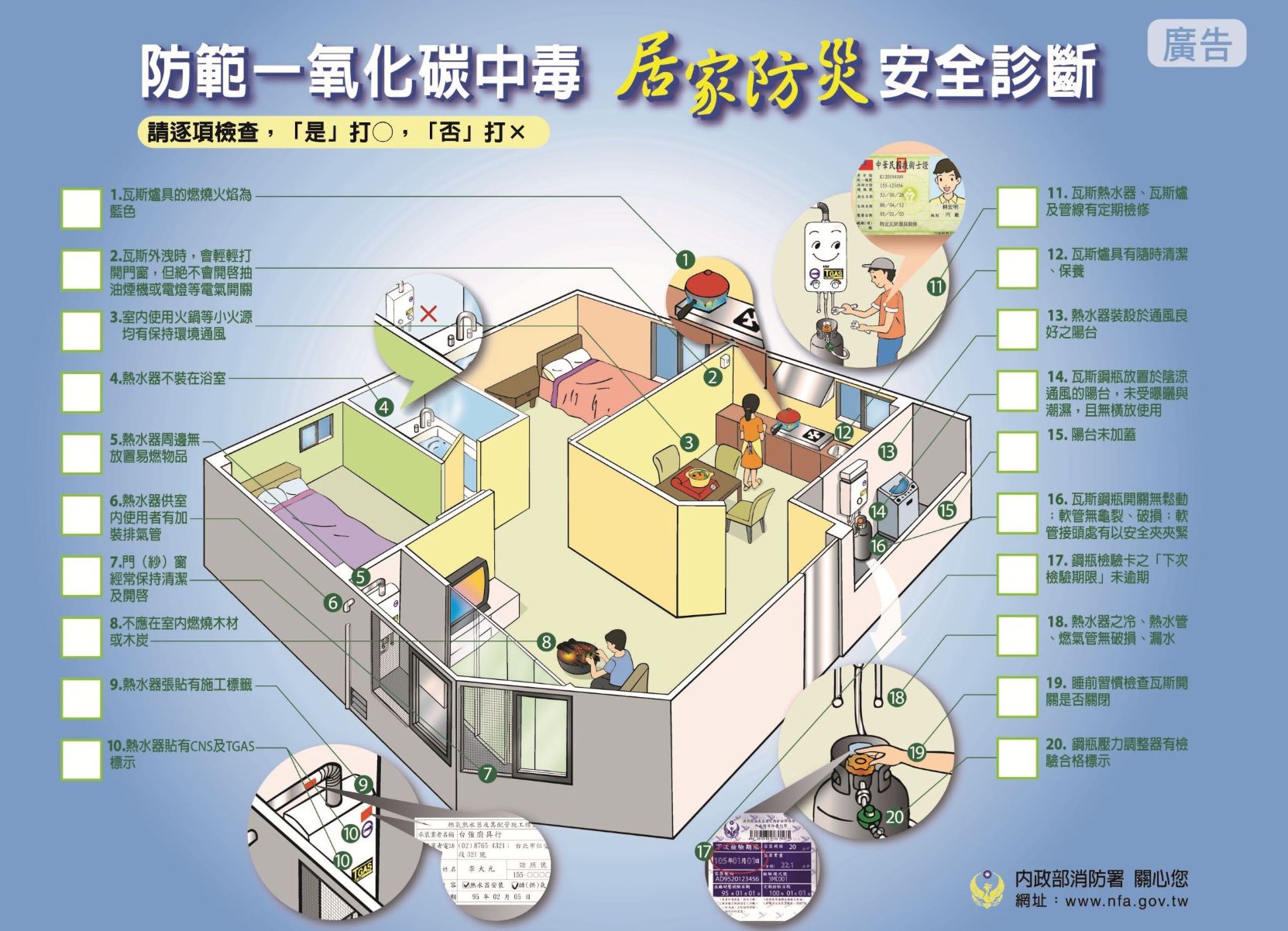 防範一氧化碳 居家防災安全診斷表(內政部消防署廣告)