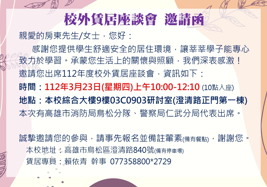 敬愛的房東,您好: 今年將於3/23(四)上午10點辦理房東座談會,誠摯邀請您蒞臨與交流(有研習證明)。 本次同樣邀請警消地政代表宣導,歡迎房東提問、增進租賃知識。 協助管理房屋或有意加入本校優質房東的親友家人們參與哦。 可在房東LINE群回覆報名或來電077358800*1118,報名時請留下姓名和用餐葷素,感謝您。 電話報名若承辦人不在,請同仁幫您登記,並留下您的手機,謝謝