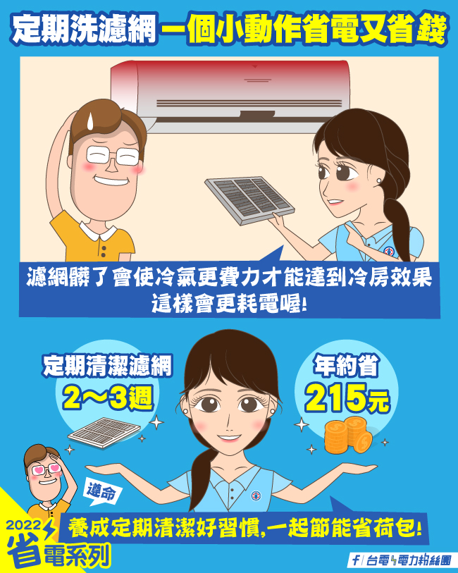今年大家已幫冷氣洗過幾次濾網了呢? 大暑到~炎炎夏日假日在家 不妨幫常上工的冷氣 清洗一下濾網吧! #它沒洗澡你就不涼喔 2~3週清洗一次濾網也能年省約215元 才不會讓濾網累積太多灰塵 造成冷房效果降低 循環空氣品質變差 洗濾網時 ●用清水或中性清潔劑輕刷濾網 ●要陰乾或輕拭乾(不可陽光下曝曬)