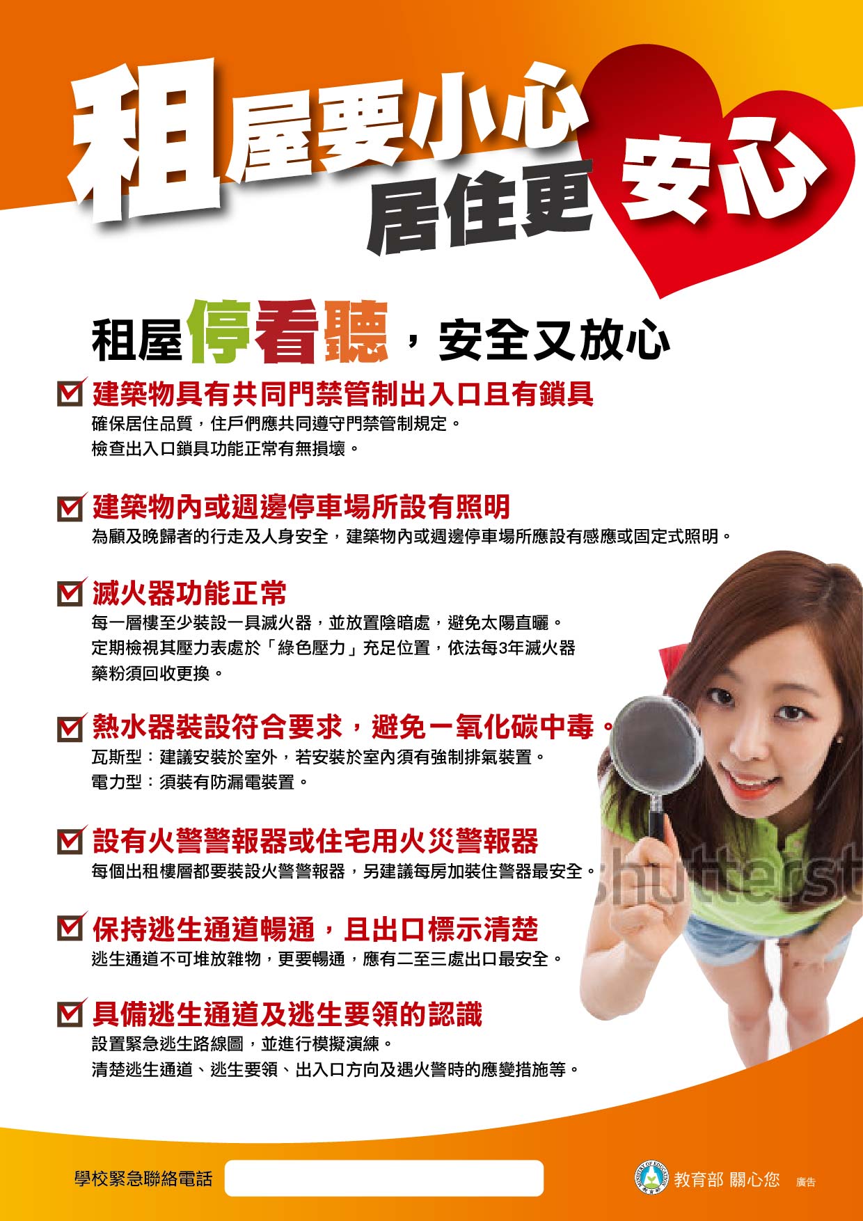 租屋前請詳閱契約書,避免租屋糾紛,並留意租屋周遭環境及是否有停車空間