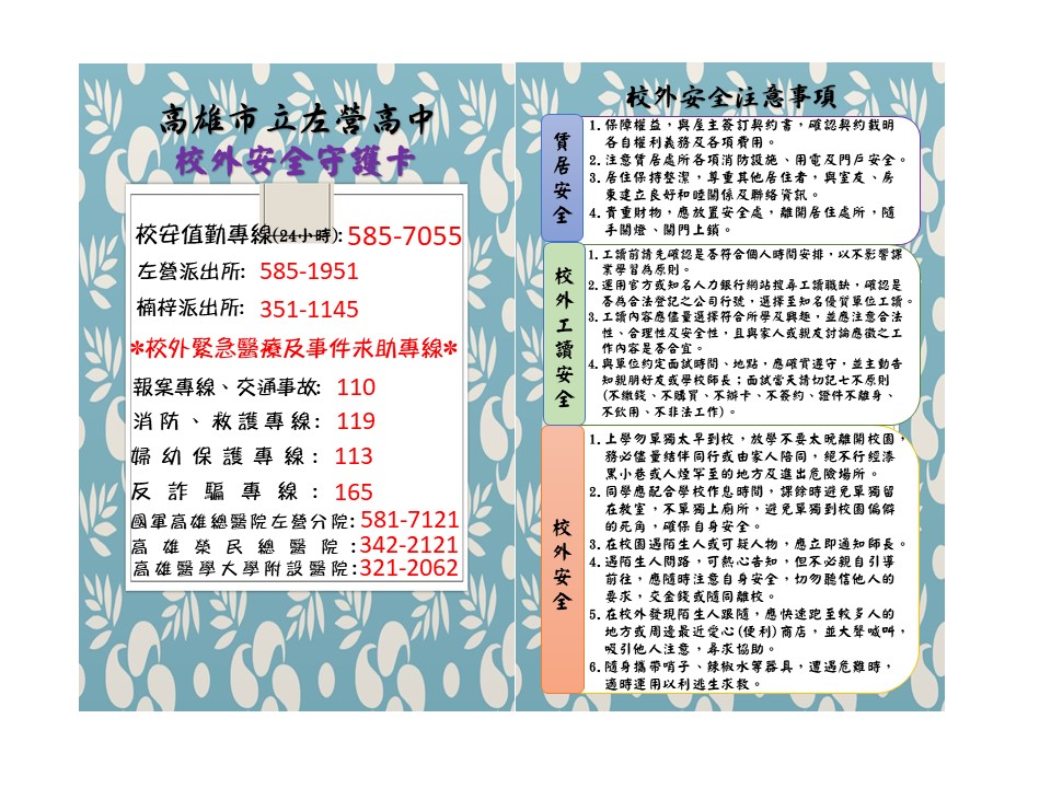 為有效強化本校學生校外賃居安全,彙整校外緊急醫療及事件求助資訊,編製"校外安全守護卡",提供師生參考使用。