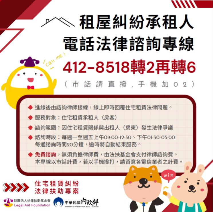 二、為維護租屋族維護租屋權益,內政部自113年8月1日起已委託財團法人法律扶助基金會提供租屋族免費租屋法律諮詢,諮詢專線為421-8518轉2再轉6(手機加02),各位如遇租屋糾紛法律問題均可善加利用。